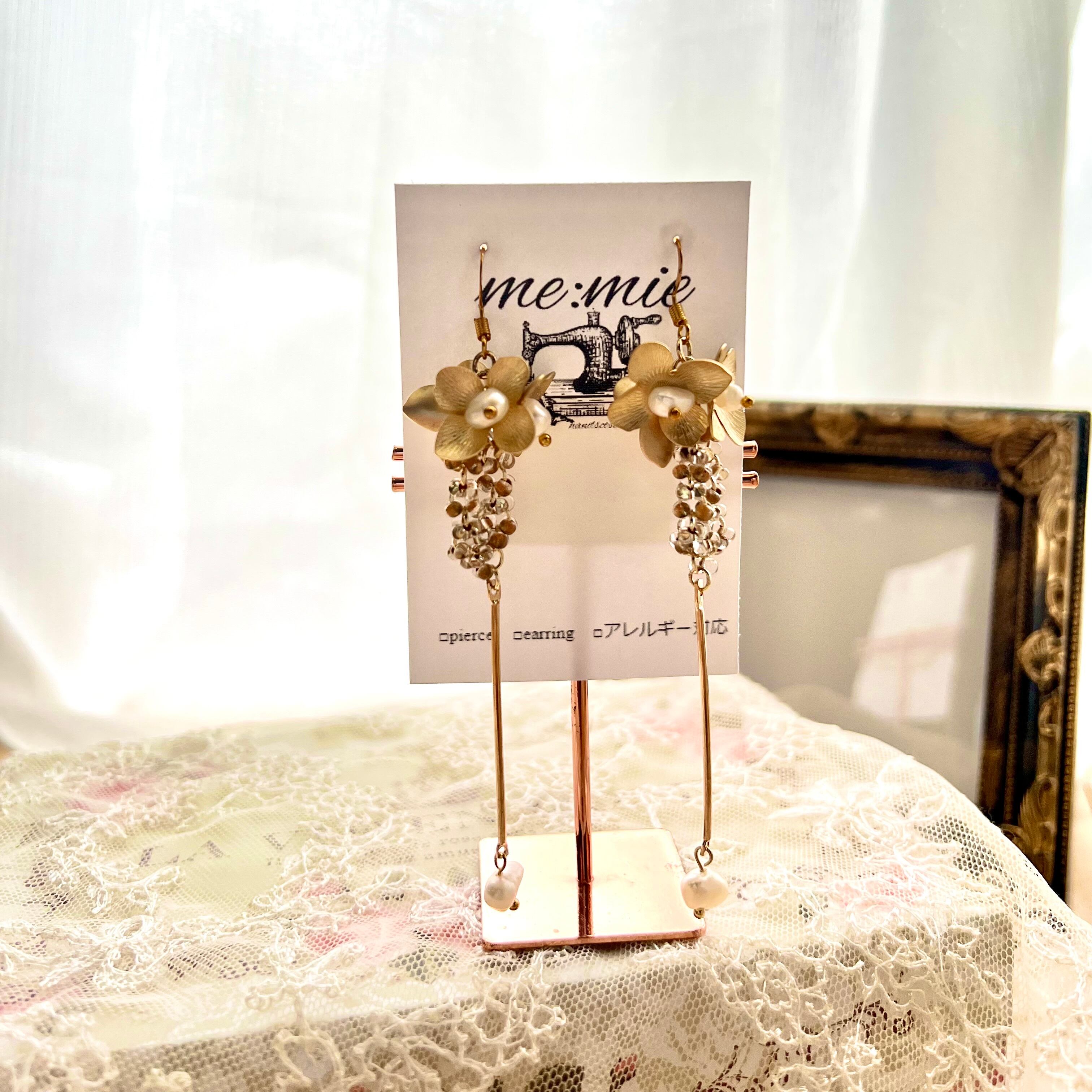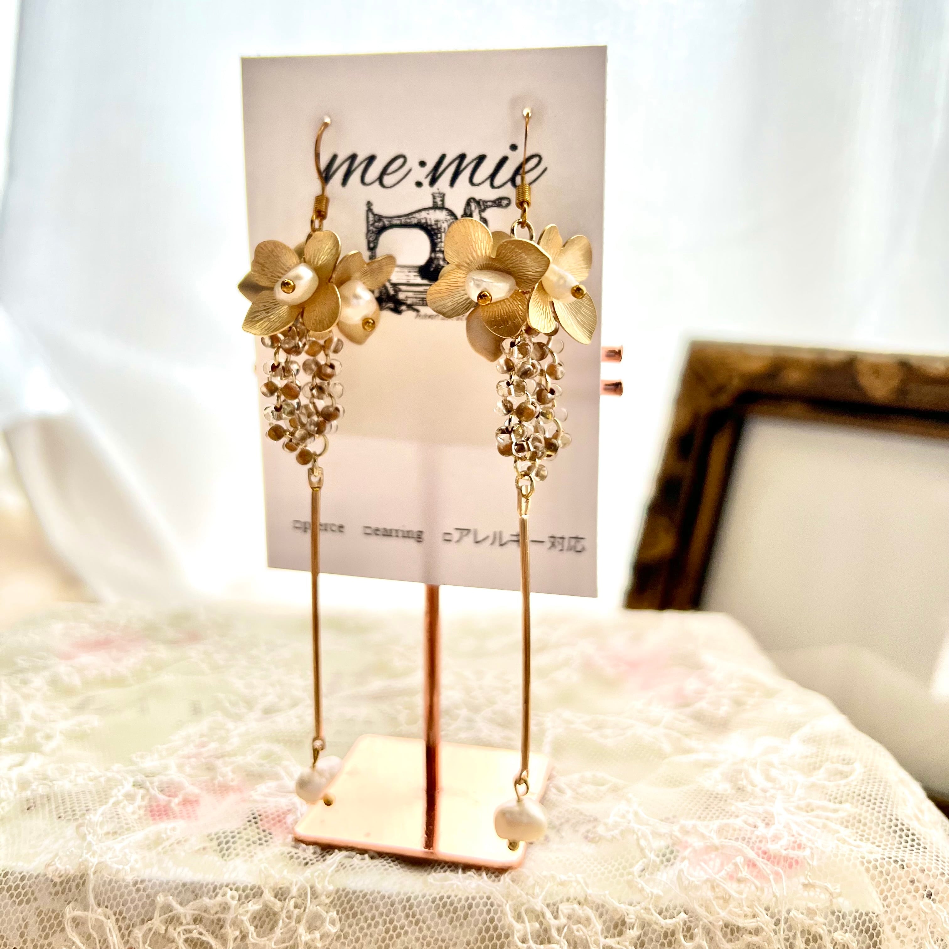 真鍮のお花を淡水パールと一緒に飾った逸品 ラスト1点となっておりますので、ご購入の際に備考欄にて《ピアスorイヤリング》のご希望をご記載ください。