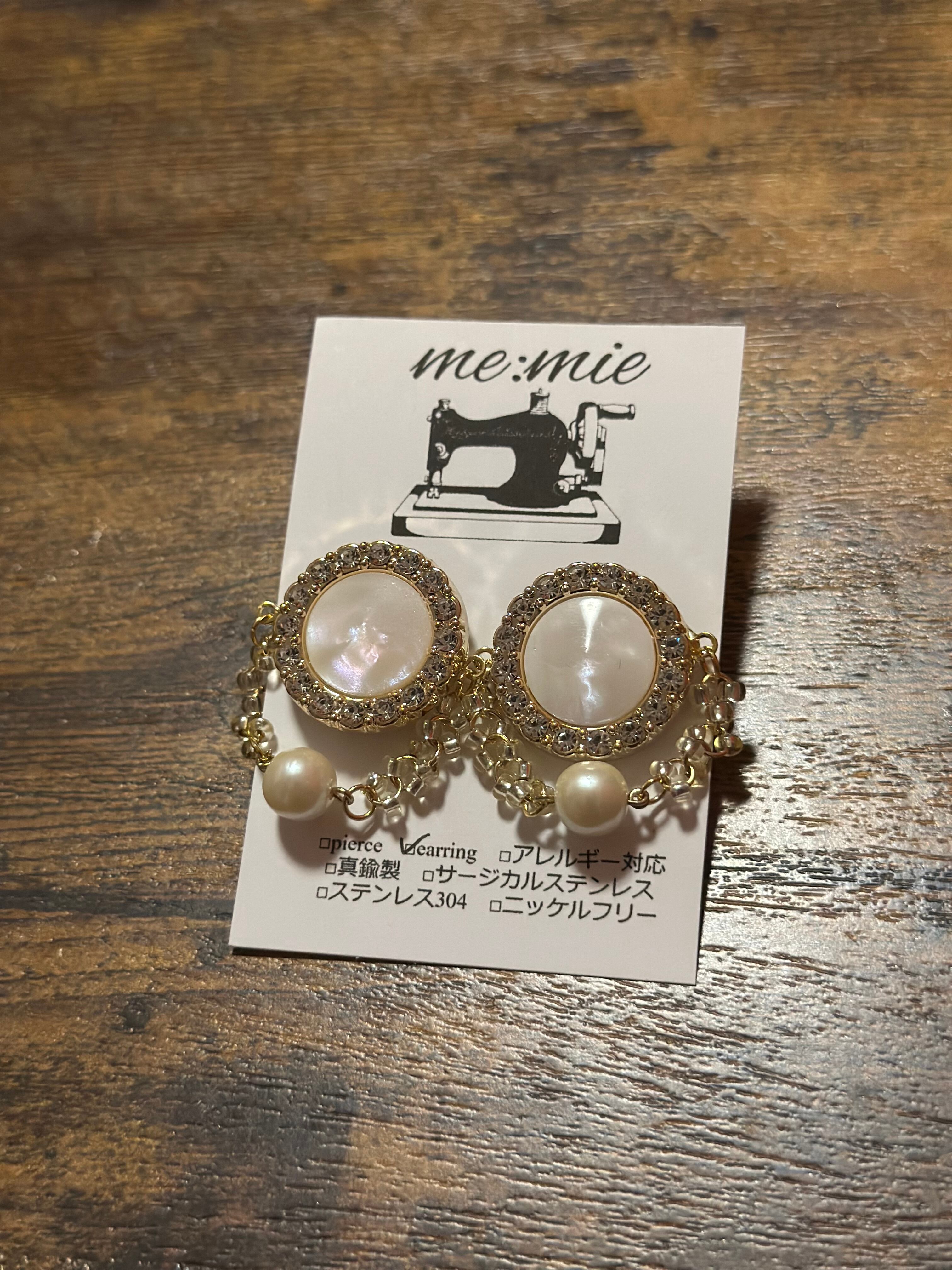 キラキラのジルコニアで縁取られたビジューボタンにビーズを丸カンで編み込みましたっ